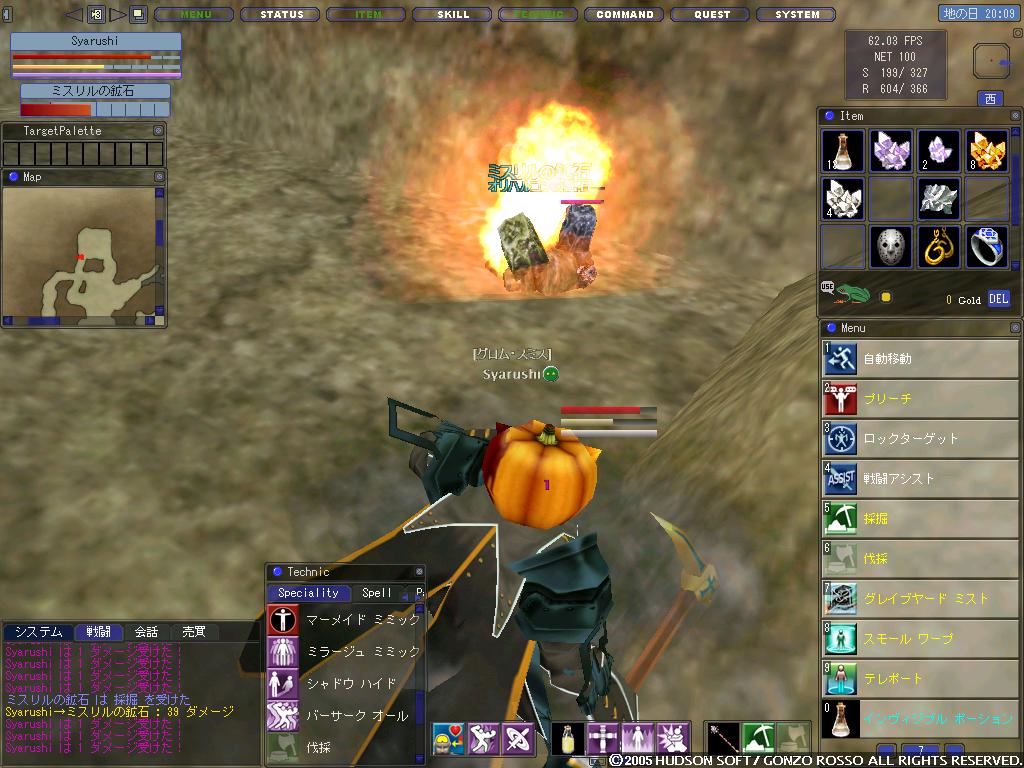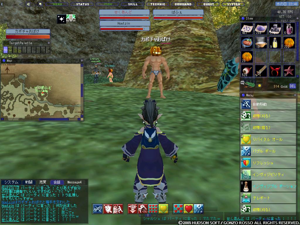 つい先日ミスリル掘ってたらオリハルコンの鉱石がPOPしましたよ! ダメージをくらいながらも必死に採掘・・・ 固いのなんのw 後半はテイマーさんからリジェネもらい余裕で掘れました^^ 後日ダメを食らわない範囲から掘れるとの情報が入り凹みましたorz 最後に収穫についてですが 丘にいる虎のところのカボチャを夜の時間帯に全滅させるとなにやら変なのがPOPするとの情報を入手! 早速シャルシェで現地に向かいカボチャの収穫を開始! しかしソロでやろうにもRepopに追いつかずに断念・・・ その後カボチャのことや、ほかの事でGlaさんとマラクス前でだべっていたらぱずぅさんが来ました 確かぱずぅさんも収穫キャラを持っていたはず・・・ そこでいきなりGlaさんがぱずぅさんをカボチャ収穫に 確か虎はアクティブだったはずだと思い、護衛がGla(せくあんど)さんだけでは心もとないのでHoatzinさんを拉致することにヽ(´ー`)ノ 現地に到着し、ひたすら収穫開始 護衛役としてHoatzinさんとGlaさんに来てもらったのはいいのですが 実は虎はノンアクティブでした/(^o^)\ 何か着いてきてもらったお二人には悪いことをしたなと思いながらも収穫をして・・・ 数分後、ものの見事にお目当てのものがPOP! 見てわかるとおりのカボチャがPOPしました^p^ このカボチャは見てわかるとおりパンダタイプとちょっとわかりにくいですが、モニオタイプの2種がPOPするようです。ちなみにパンダタイプ1にモニオタイプ2です ぱずぅさん曰くパンダはHPが高く、モニオは回避が高いとのことです モニオには刀剣80収穫90↑の自分でも結構回避されましたorz また、こいつは収穫でしかダメージを与えられず、ちょこちょこパフォ技や通常攻撃(一桁)をしてきます そして無事ぱずぅさんと二人で3つの変なカボチャを刈りましたヽ(´ー`)ノ ちなみにDropは各お化けかぼちゃ×3 この後、暇になったのでどうしようかということで、ぱずぅさんにCCしてきてもらって地下水路のネイチャーへ特攻することに 道に不安がありましたが、迷うこともなく無事到着し、攻撃開始! ぱずぅさんのCaieと自分のシャルシェの厚い回復で誰も死なずに撃破! 厚い回復といっても、自分はGHしかしてなかったわけですがw (まだHAとRA80%じゃあないんですよ!ウワァァァァァァヽ(`Д´)ノァァァァァァン! 最後のほうなんて暇になってチェインソードで攻撃に参加しましたよw 正直、ネイチャーってこんなに弱かったっけ? とか思うぐらいあっさりでしたw そして取れたターメリアでぱずぅさんの蝶リボンを染色しました ってアッー、染色リボン着たぱずぅさんのSSを取り忘れてしまった/(^o^)\ まぁ、綺麗(?)な緑で喜んでもらえたからよしとしますw